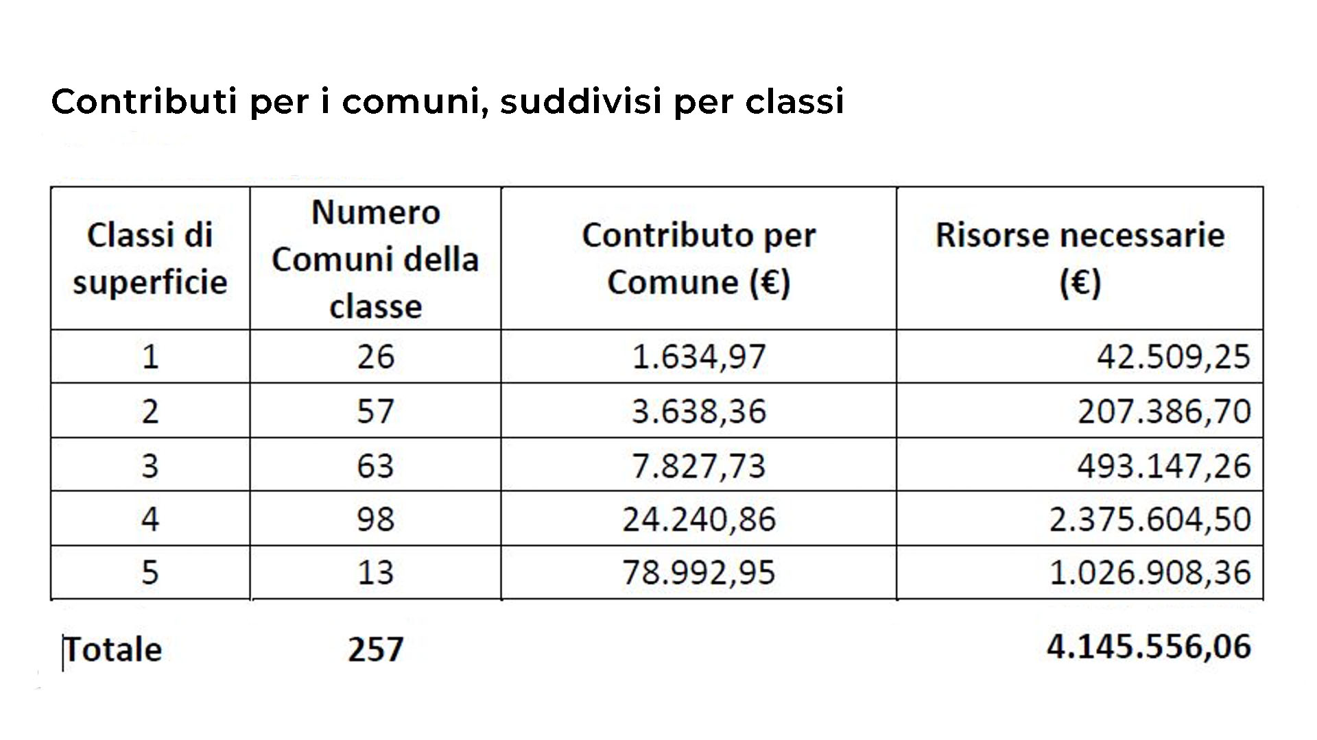 Per i Comuni, il contributo viene calcolato sulla base della superficie territoriale, suddividendo gli enti in cinque classi dimensionali e attribuendo le risorse in proporzione ai chilometri quadrati, così da garantire un sostegno adeguato alle diverse realtà territoriali. Per le Province, invece, il contributo è determinato in base all’estensione della rete stradale provinciale, assicurando risorse proporzionate alle aree da gestire e agli interventi necessari.